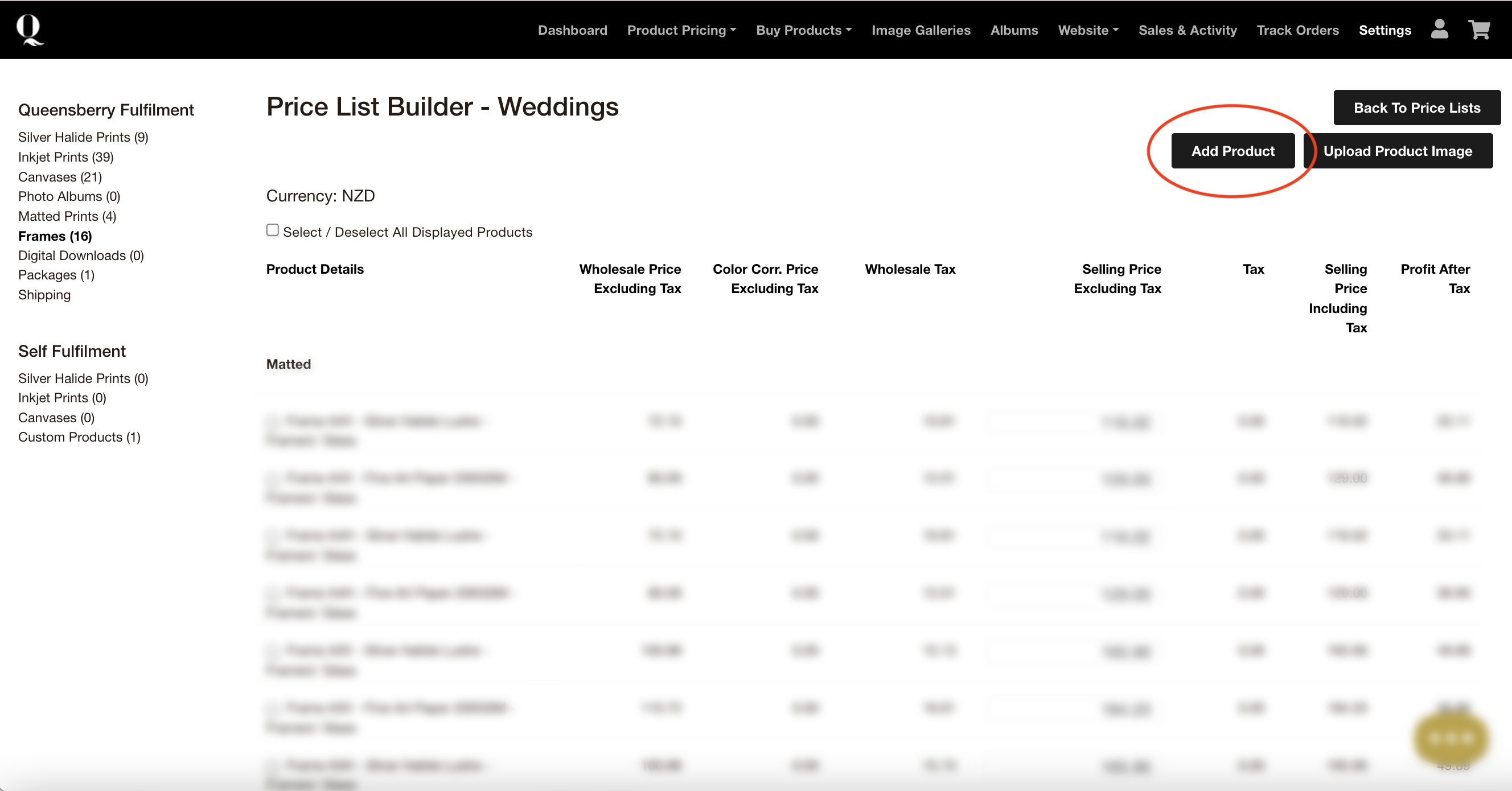 Workspace will ask you a series of questions, related to this price list, for example if you'd like the images colour corrected by Queensberry after you've made a sale. Complete these questions then click the button "Continue to Select Products".