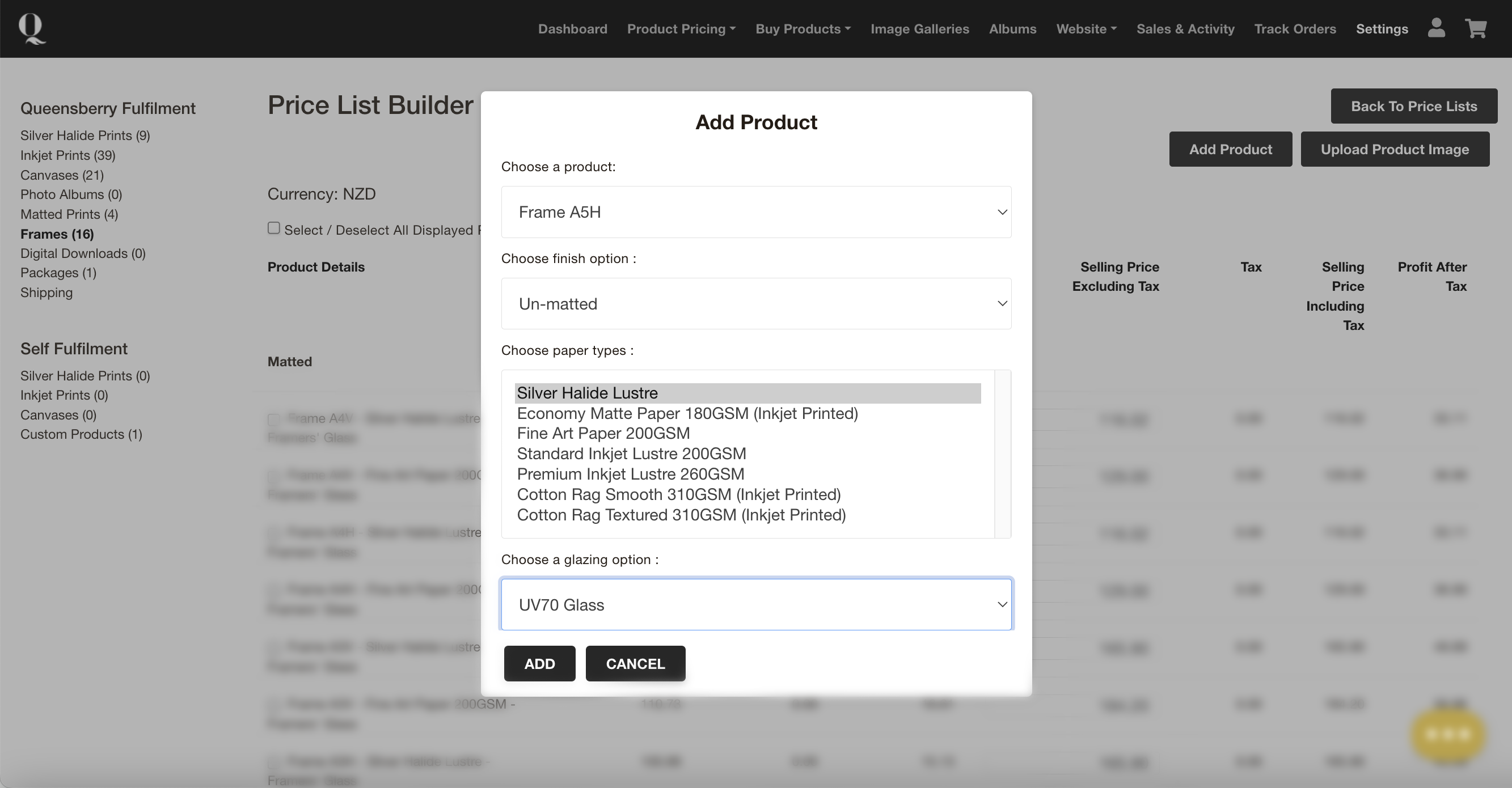 Now it is time to select the product you wish to offer within this price list. On the left hand side you'll see a list of product categories e.g. prints, frames, canvases and downloads. Click on each product category and select the sizes you wish to offer.