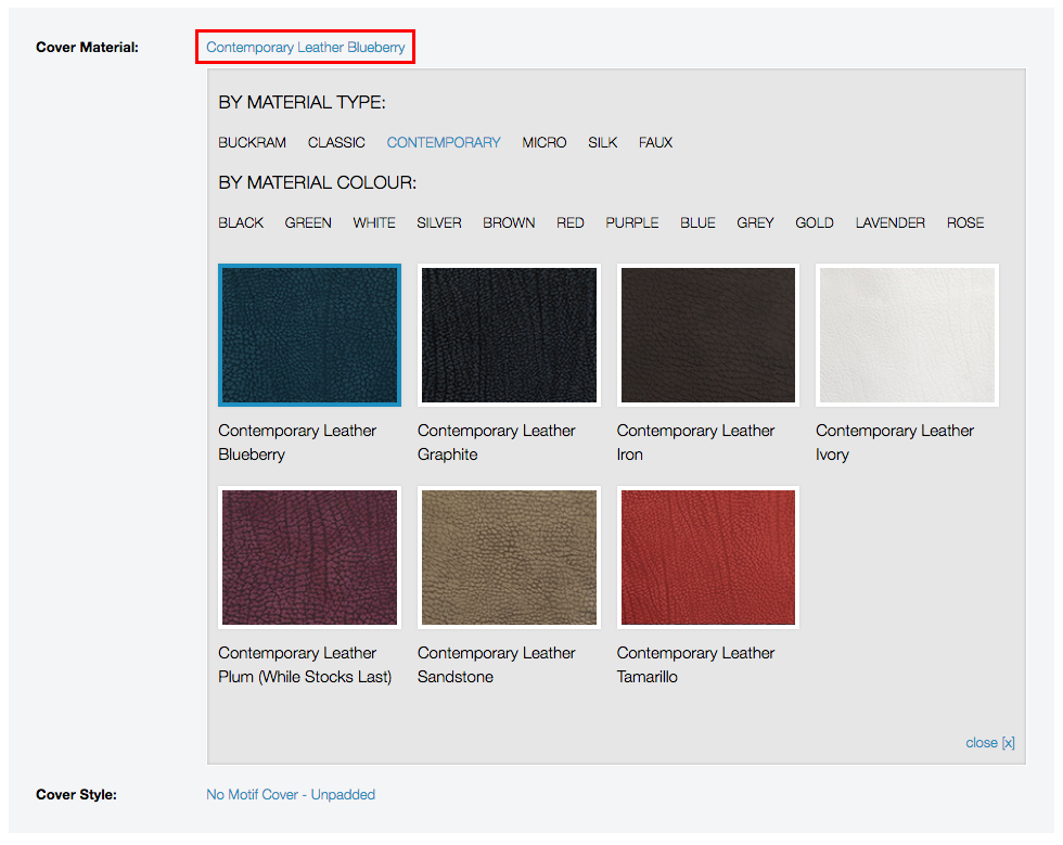 Step Five: Select a new material. In this section you can also change your cover style (below materials).