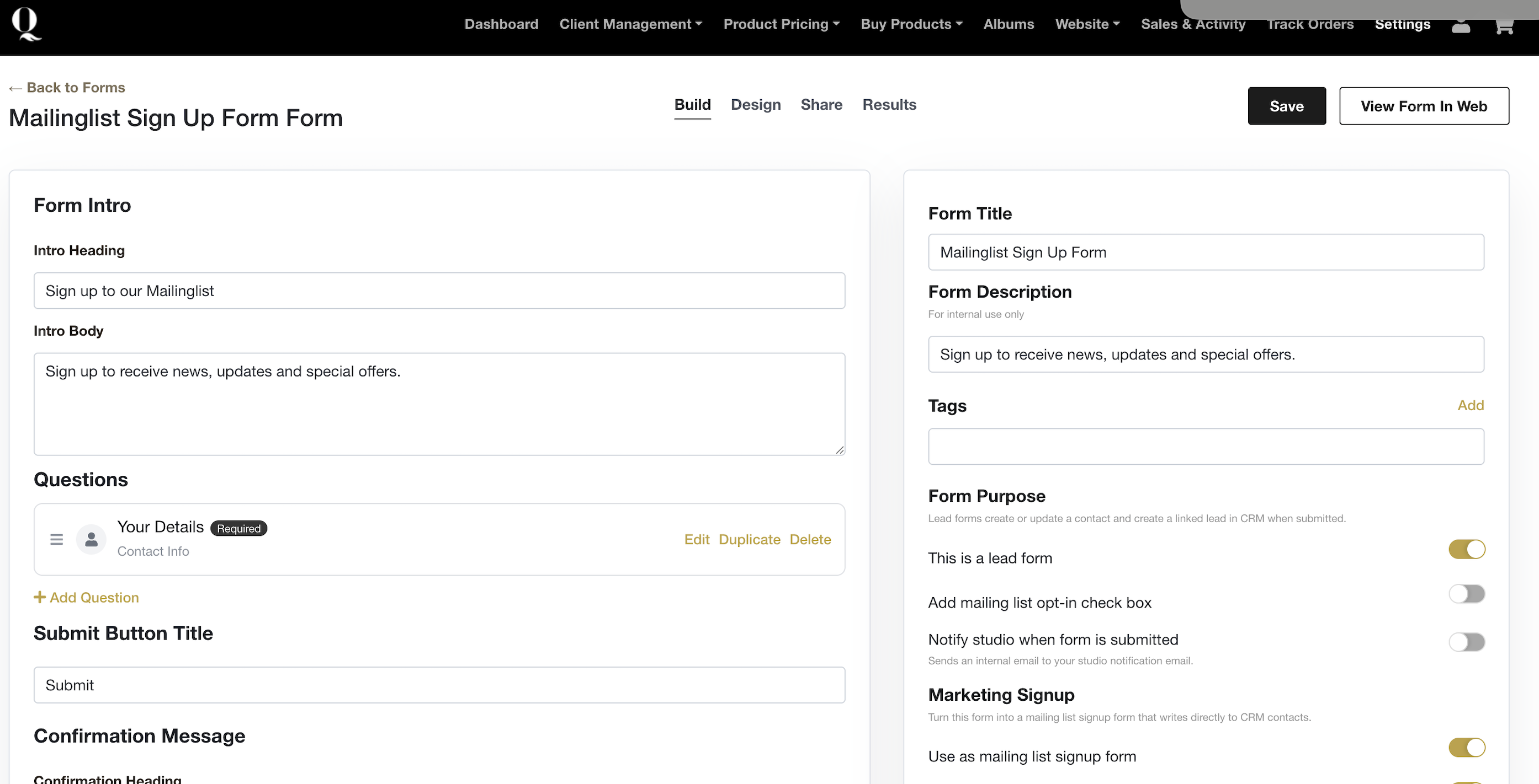 Forms can also be used specifically to grow your mailing list. When set up this way, submissions are added directly to your audience.