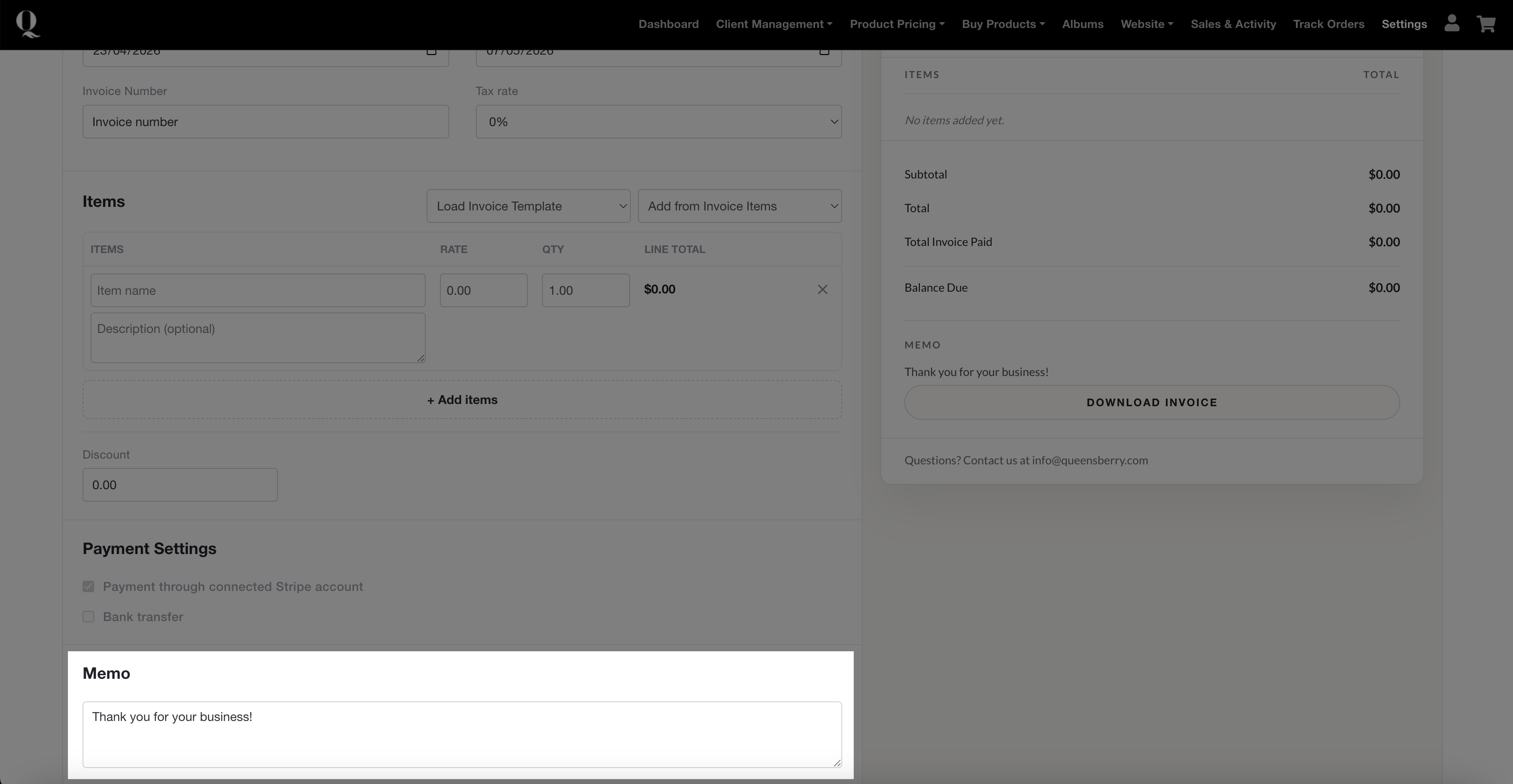 Include any notes for your client (e.g. a thank you message or payment instructions).