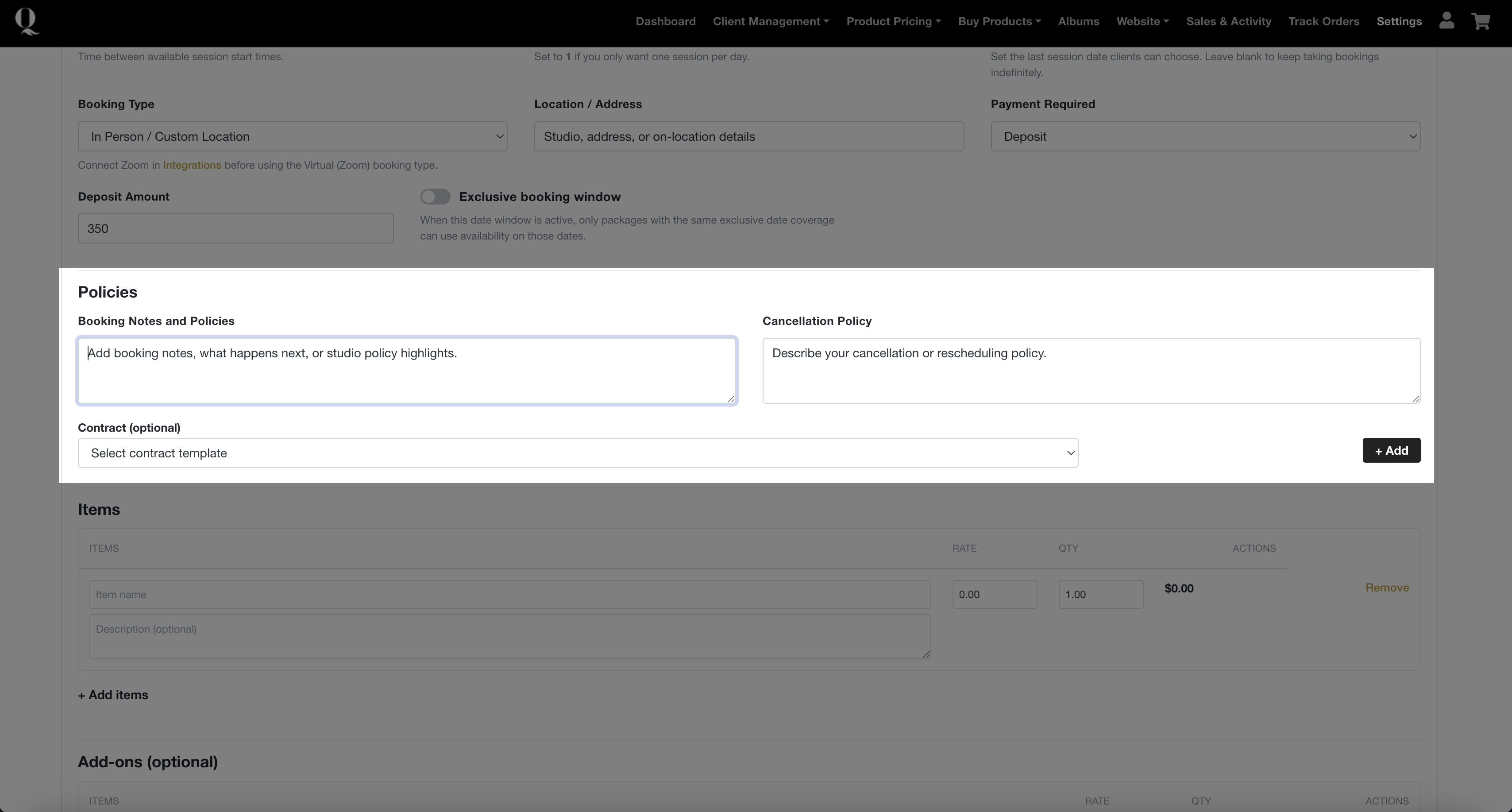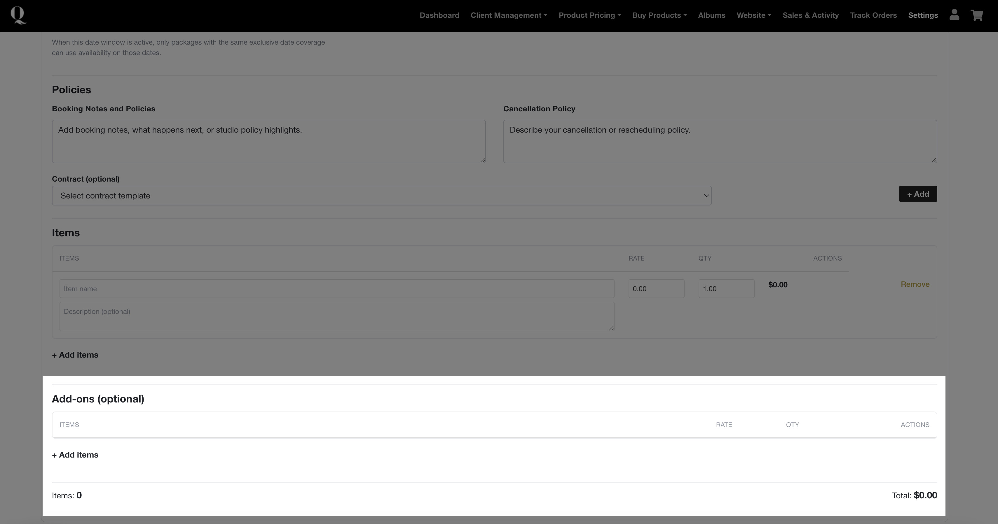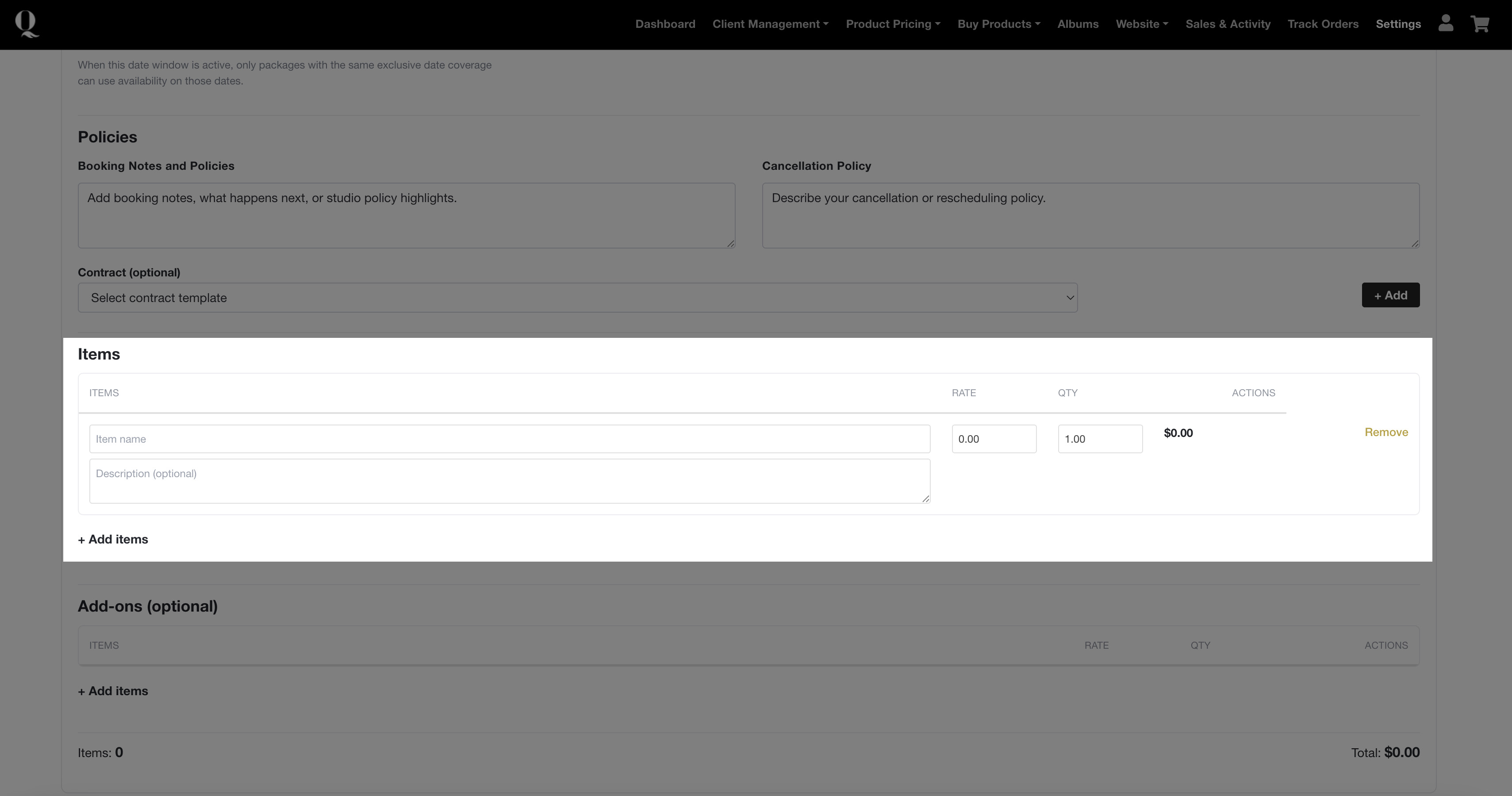 Under the Items section, set what is included in your base package (your minimum session cost), such as: